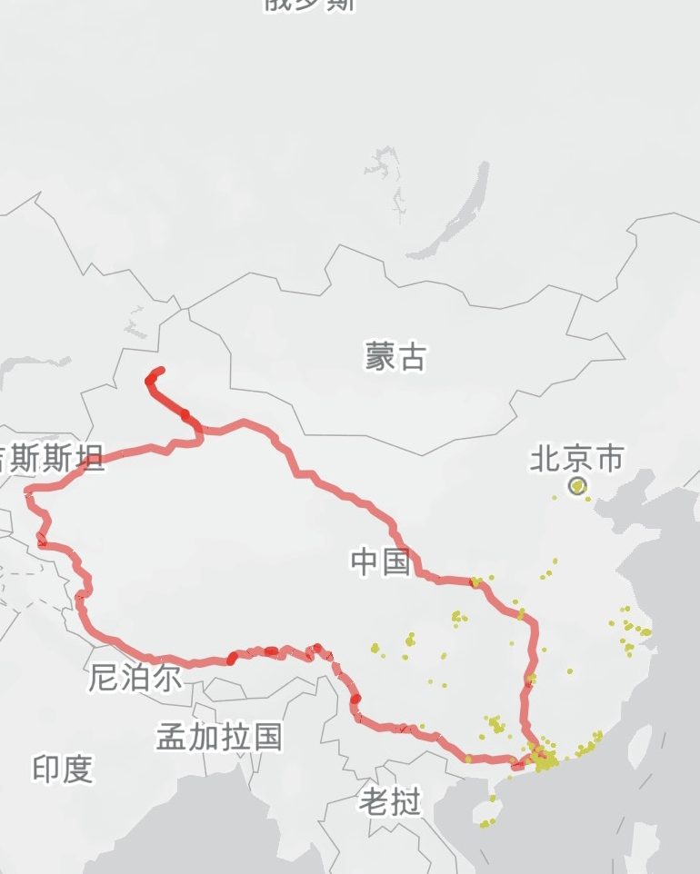 完成 广东-广西-云南-西藏-新疆-甘肃-陕西-湖北-湖南-广东 大环线